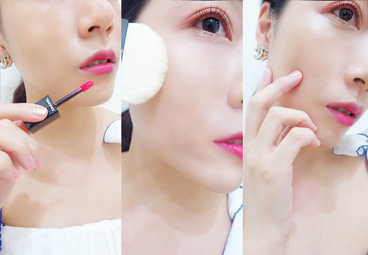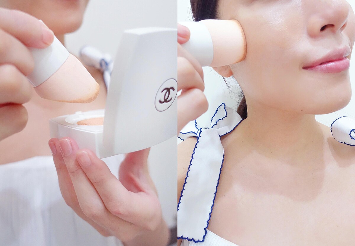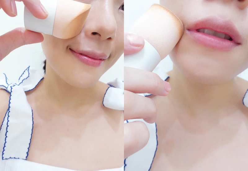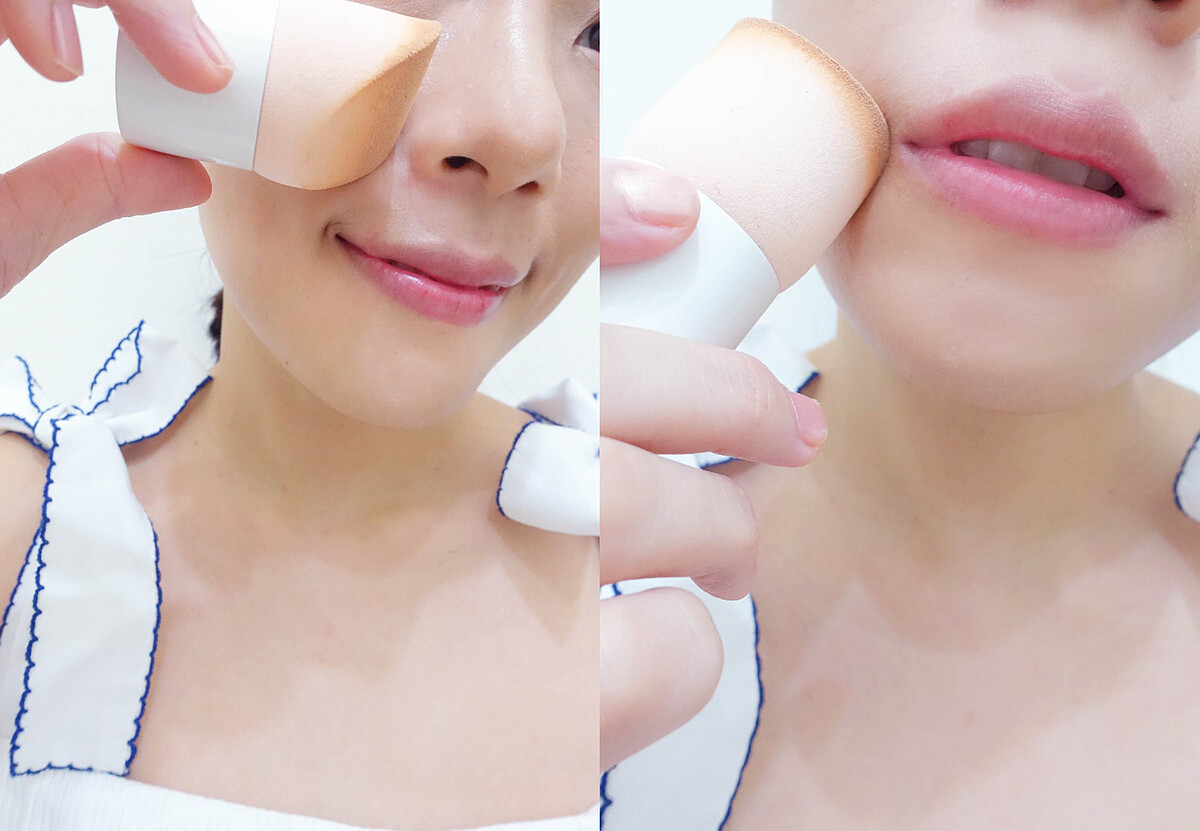全臉都完全使用這支「珍珠光感斜角粉撲」完妝,先大面積使用斜角頂端平面,全臉刷過之後,再輕拍臉頰讓粉體更服貼,再加強按壓少量粉底在欲遮瑕的部位,像是黑眼圈,用輕點按壓的方式,越拍越遮瑕、越拍越輕盈透亮,果然仙氣十足呀~