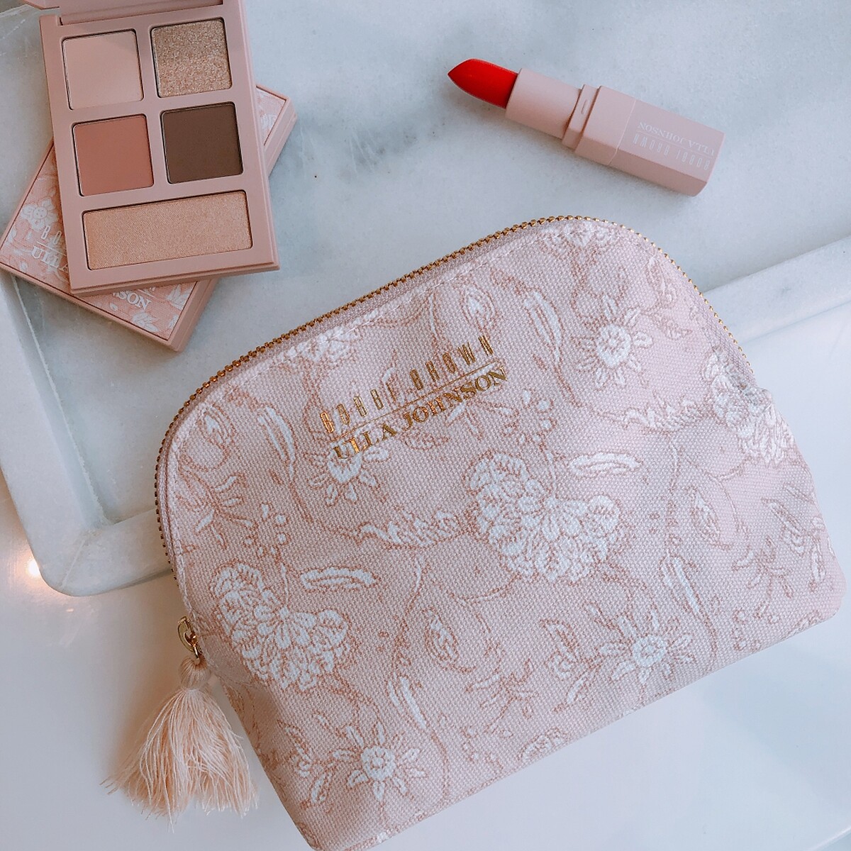 購買任2件商品且含一彩妝盤,即贈 「Ulla Johnson 花樣流蘇聯名化妝包」乙個(活動時間請洽詢各專櫃)。