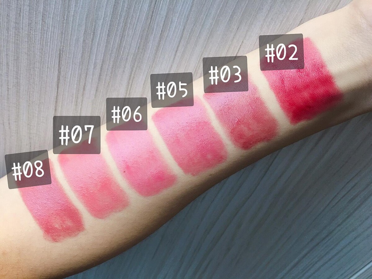 精選6款超人氣色號(在日本是10款色號),是日系妝容最經典的紅、粉、橘三大色調,紅色系的#02熱戀(台灣人氣色)、#03曖昧,不挑膚色皆可達到提亮膚色、顯牙白的效果,並展現大女孩般的活潑熱情和小女人般的恬靜優雅;#05怦然(台灣人氣色)、#06心動屬粉色系,能更襯托出白皙的肌膚,帶給女孩如戀愛般甜美可愛的好氣色;#07觸電、#08邂逅(台灣人氣色)為帶暖調的橘色系,不僅能修飾肌膚蠟黃,增添健康活體,並讓女孩散發安心、無害的魅力。