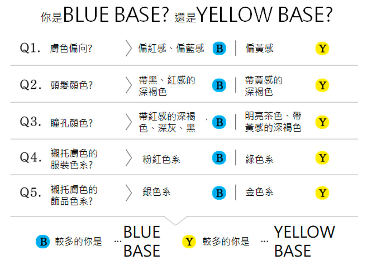 在挑口紅顏色前,先來個簡易的肌膚色調自我測試,了解了自己屬於冷色調的BLUE BASE或是暖色調的YELLOW BASE,只要挑選與自己肌膚色調相同的本命色口紅,怎麼樣都不會出錯!