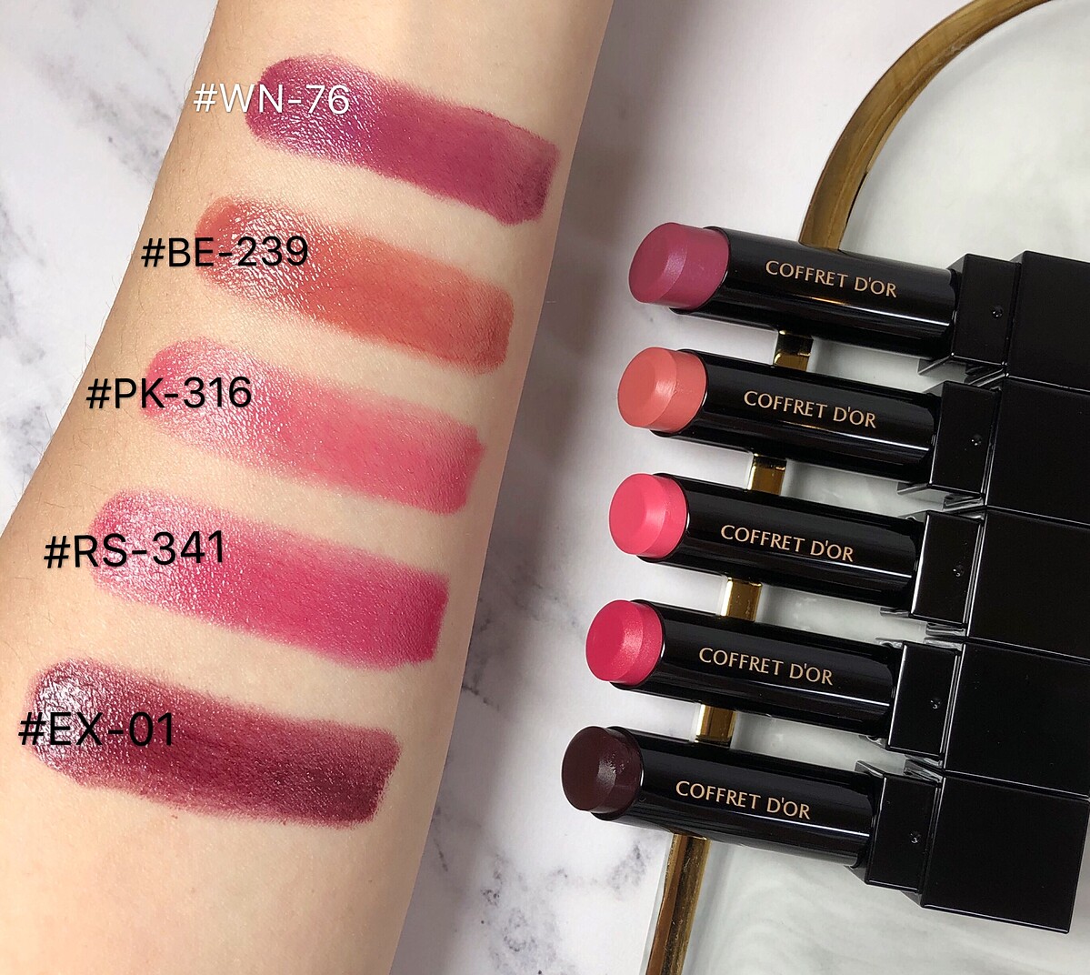 冷色基調的水光我型口紅共有5款顏色,從 #WN-76紫紅色、#BE-239奶茶玫瑰色、#PK-316粉紅色、超顯白的#RS-341玫瑰粉、到大人感的#EX-01酒紅色,從試色就可以看得出來這次的口紅真的很顯色,跟唇膏本身就是零色差!