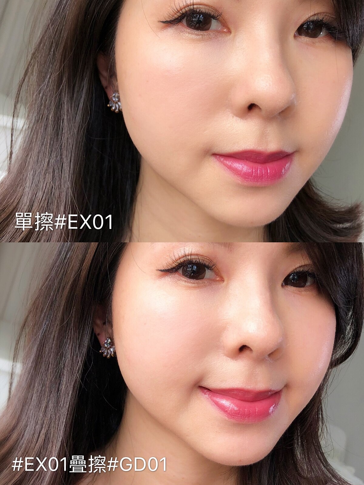 兩款唇色一起比較更能看出差別,有沒有發現原本的冷色調酒紅#EX01再加上#GD,變得柔和了!