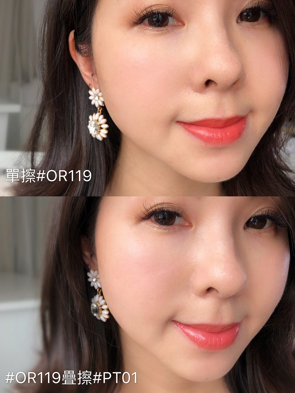 接著再疊擦薰衣草紫色的 #PT01後,原本顏色鮮明的亮橘色變成柔和的粉橘色,跟原本的唇色呈現不同氛圍,但不得不說一樣很好看耶!而且完妝光澤大幅提升,唇紋都看不見了~