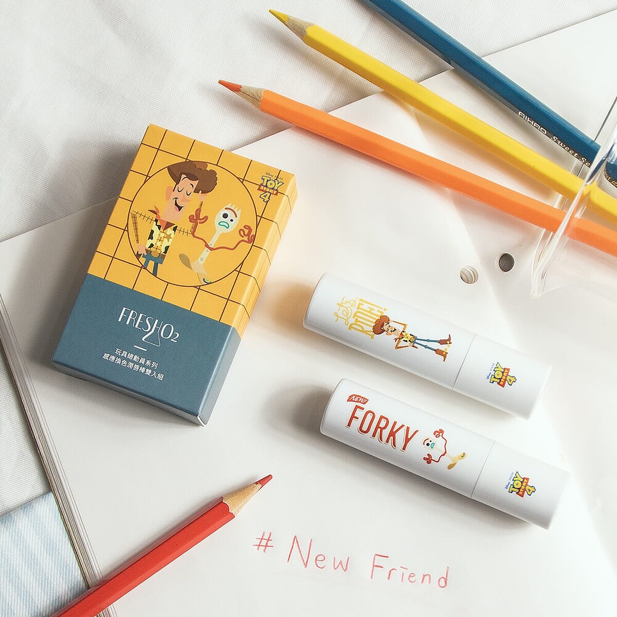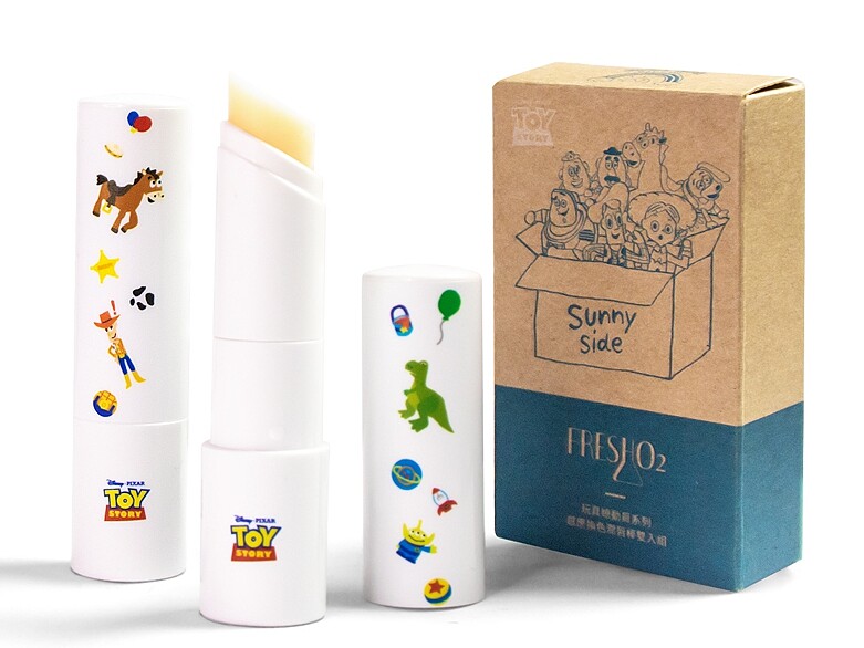 FreshO2推出的TOY STORY玩具總動員聯名彩妝在6/20《玩具總動員4》電影上映,同步推出加碼的隱藏版商品。第一個就是讓「胡迪與叉奇」躍上最經典的pH值感應換色潤唇棒,採兩入組販售,一次能擁有玫瑰與莓果兩種口味。
