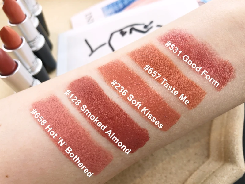 這些新色皆屬於時尚專業唇膏,5個新色為:#128 Smoked Almond、#531 Good Form、#657 Taste Me、#236 Soft Kisses、#658 Hot ‘N’ Bothered