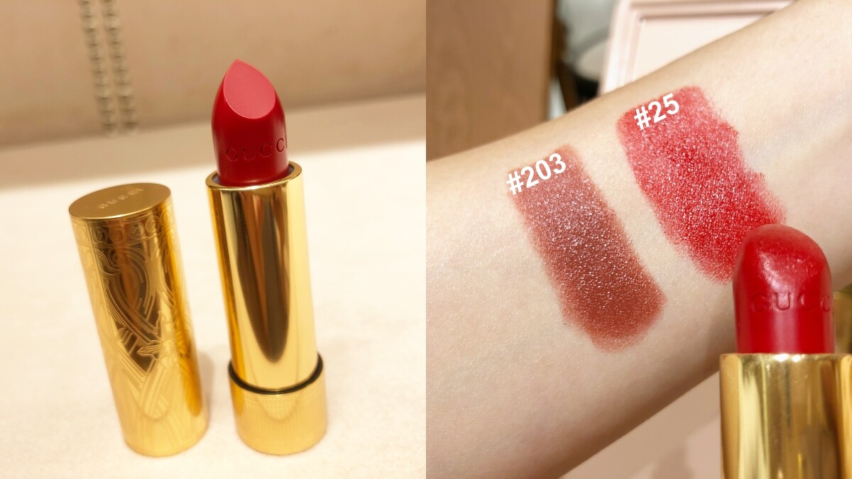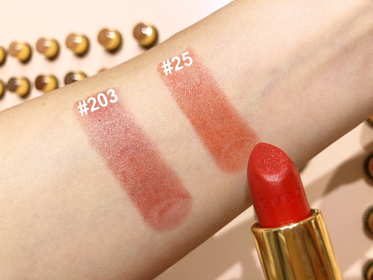 ↑絲漾唇膏擦起來比緞面唇膏更為水潤,看同色的#203與#25試色就知道。