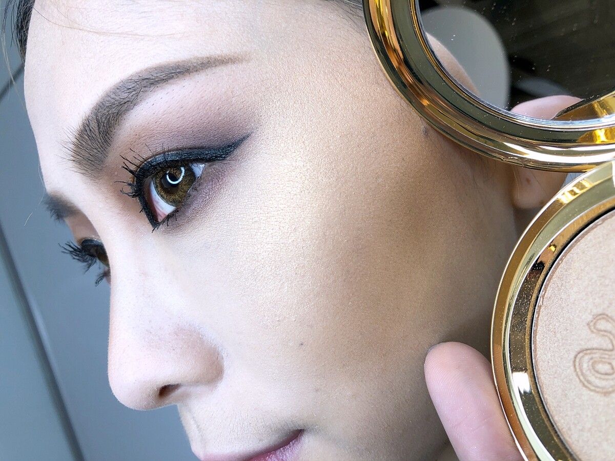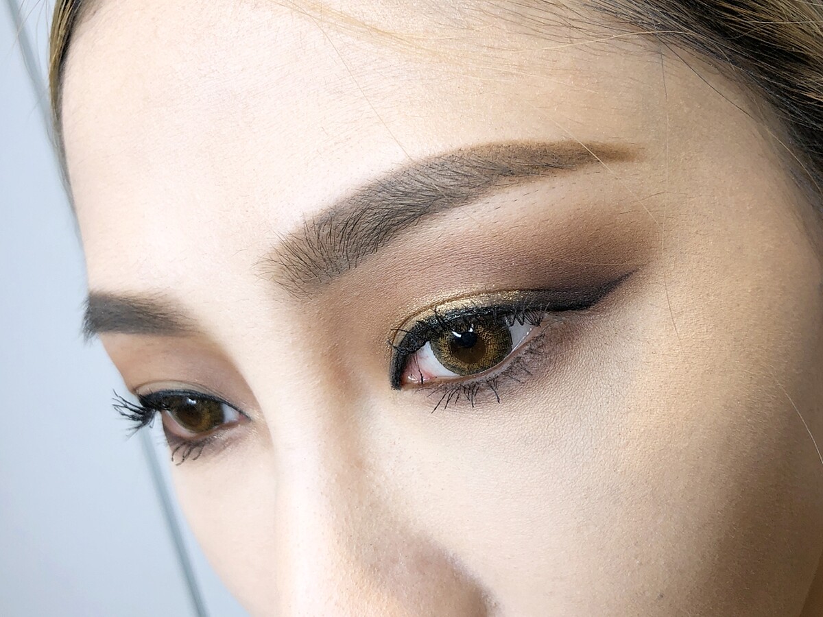 STEP2:以雙眼皮折線為基準點,使用深色光澤材質的眼影由折線以下,沿著眼型做橫向的打亮暈色,於眼球中央處再疊上淺一點的打亮色,創造光暈般的亮色暈染。