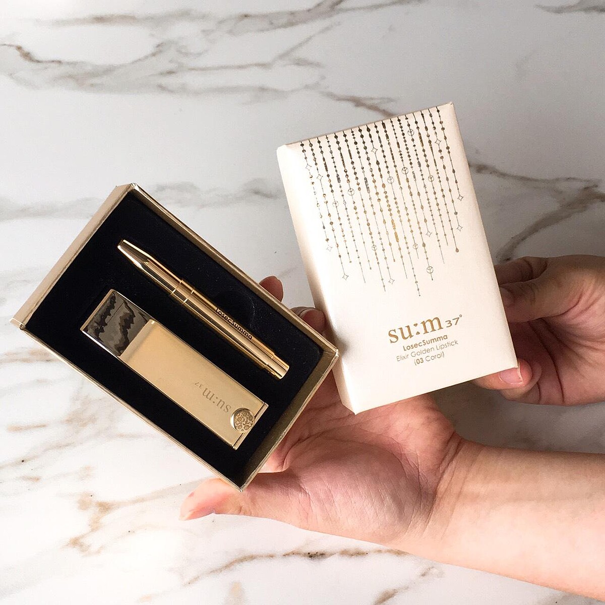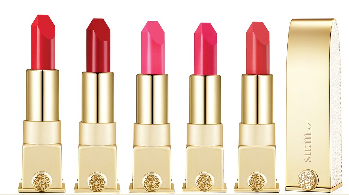 su:m37「金萃無痕絲絨完美唇膏」,添加了品牌獨家的珍貴發酵精華成分及積雪草積雪草皂苷,並且具備顯色力強的高濃度色彩配方,不僅能畫出鮮明艷麗的唇色,同時也具備保濕與改善唇紋等滋養效果,值得一提的是,唇膏尖端的「稜角型」設計,能用「窄面」畫出銳利的唇形線條,並用「寬面」畫滿其餘唇部面積,透過此立體設計,可畫出更精緻、乾淨、線條分明的唇妝。