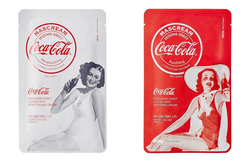 面膜組外盒做成「復古販賣機」造型,面膜袋上更有經典可樂女郎肖像,讓保養時光更富懷舊趣味。