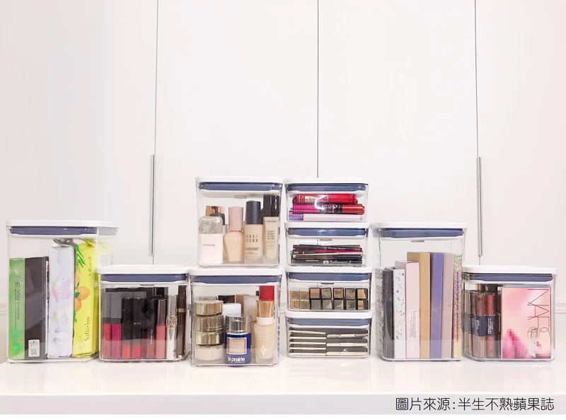 可以將彩妝物品放在保鮮盒中保存,像是恆隆行代理的紐約收納品牌OXO按壓保鮮盒,18個尺寸可依照物品的大小選擇使用、透明設計也能讓內容物一目了然,單手按壓即可密封、開啟,通過上蓋凹槽設計將不同尺寸互相穩固堆疊,不只輕鬆防潮,更讓生活空間變得整潔美觀!