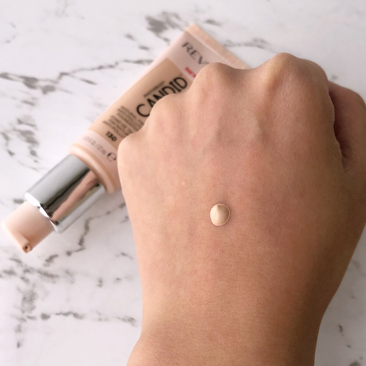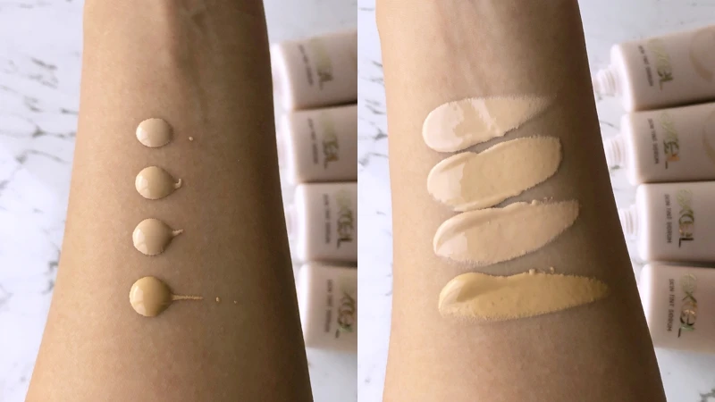 評比:質地偏液狀,很好塗抹,感覺輕透不厚重,細看還帶有微粒珠光粉末讓膚色更亮。採用裸管狀的設計,外出帶著也方便。