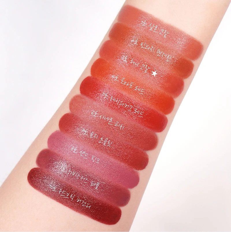 同樣有10色:#01蜜桃奶茶、#02醇熟珊瑚、#03甜膩柑橘、#04性感番茄、#05焦糖橘子、#06紅心女王、#07棉花糖粉、#08芭比桃粉、#09摩登嫣紅、#10暖磚紅棕
