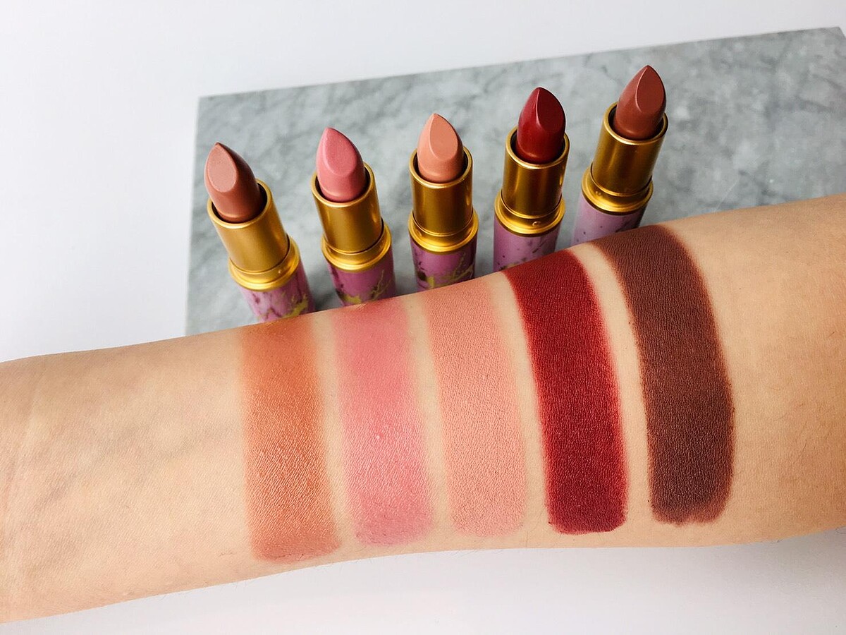 ↑↑↑唇膏色號(由左到右):The Naturalist 暖桃裸色 (Lustre)、Let’s Mesa Around 淺玫粉色 (Lustre)、Feelin’ Sedimental 珊瑚杏色 (Satin)、Natural Born Leader 冷調莓紅色 (Matte)、Life In Sepia 紫調焦糖色 (Matte)