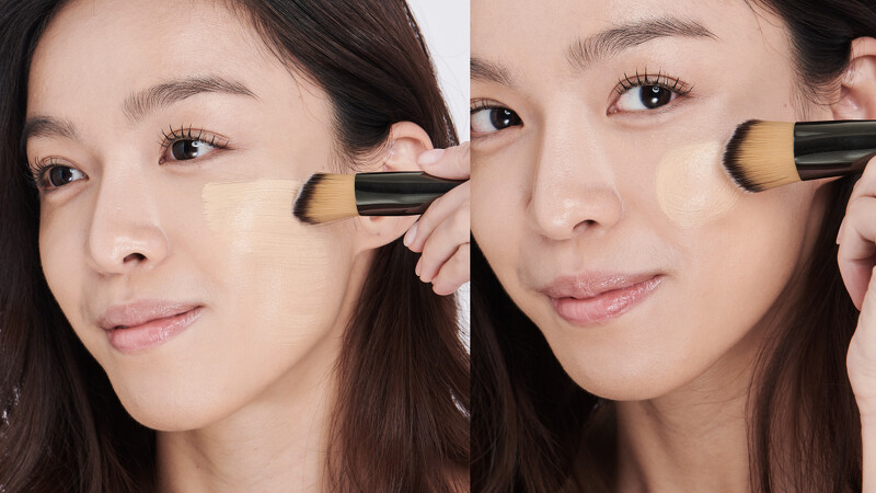 因為這罐粉底除了高遮瑕,更重要的是蘊含滿滿的水分,透過親膚的草萃取物與甘油,加上光澤提亮精油,當刷上粉底的那一刻就立刻肉眼可看到肌膚變歐膩(笑),化妝師非常建議大家可以挑選兩個顏色:自然色與淺膚色搭配使用,畢竟遮瑕效果好,能避免一般遮瑕膏讓肌膚卡粉甚至顏色不均的狀況發生。