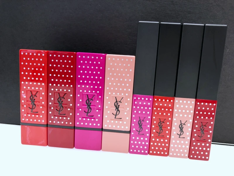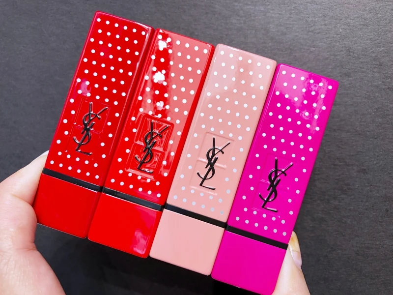 YSL換上圓點點的口紅有「金管唇膏」奢華緞面唇膏、「小金條」奢華緞面絲絨唇膏,各別有四色。將於7/27限量開賣。除了單買之外, 也會搭配情人節禮盒一起販售。