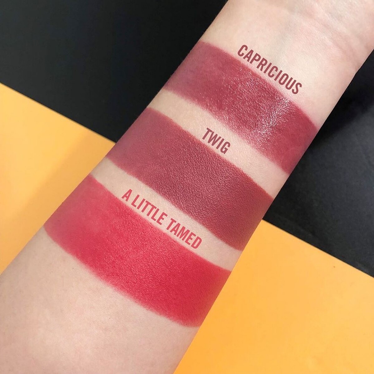 煙灰玫瑰色系的子彈口紅有#CAPRICIOUS 煙灰玫瑰色、#TWIG 漿果玫瑰色、#A LITTLE TAMED 乾燥玫瑰色。