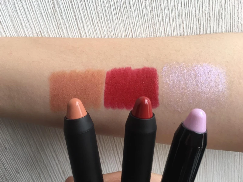 ↑↑↑ SUQQU晶采艷色霧唇筆 #105染赤 SOMEAKA NT1,500 (左)、SUQQU 晶采幻光亮彩棒 #101菫星 SUMIREBOSHI NT1,500 (中)、SUQQU晶采艷色霧唇筆 #104淡香 USUKOU NT1,500 (右)