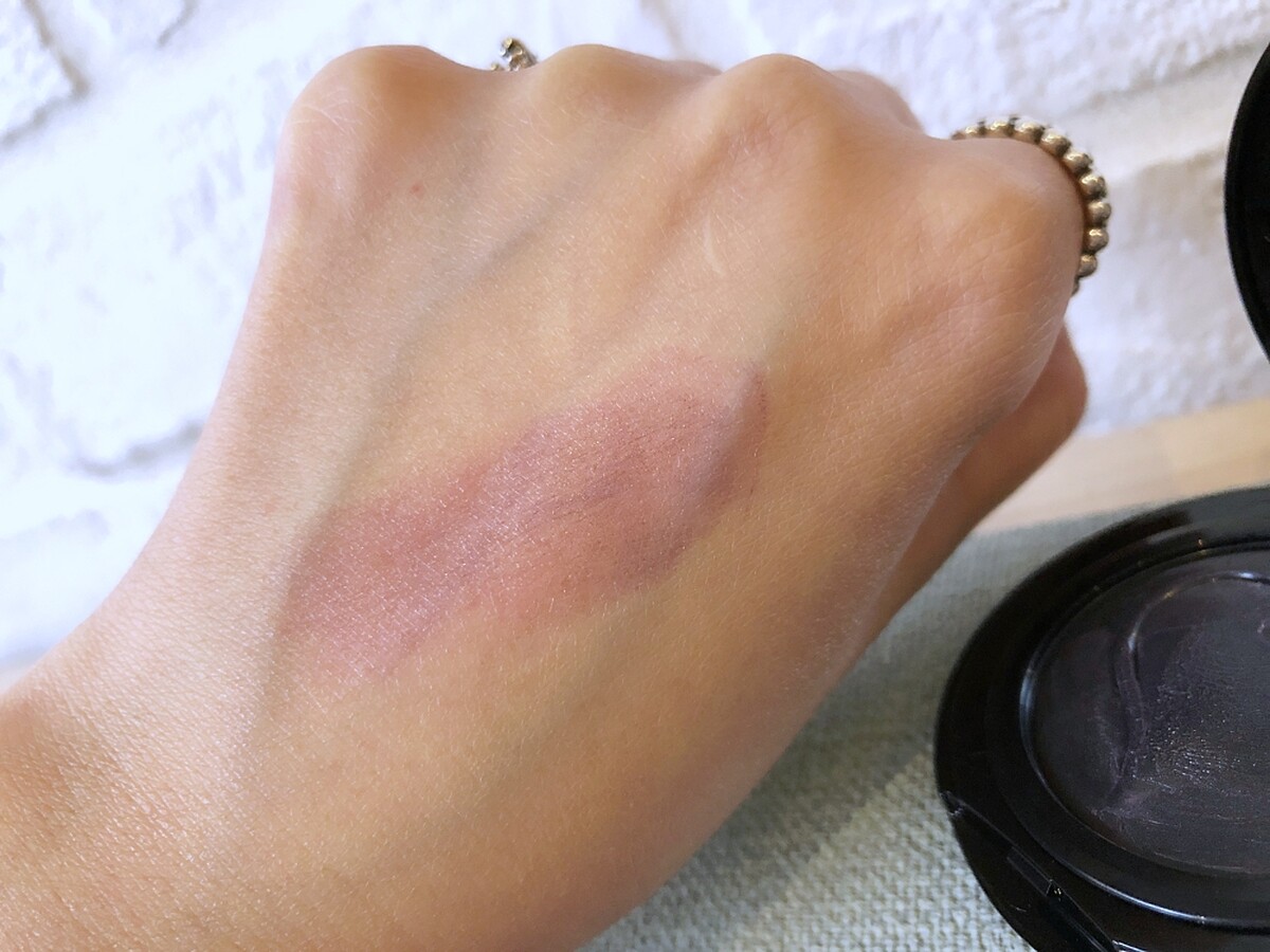 乍看下是黑色霜狀的頰彩,但觸碰到肌膚時會因有水分時產生顏色變化,變成淡淡的紅潤感。