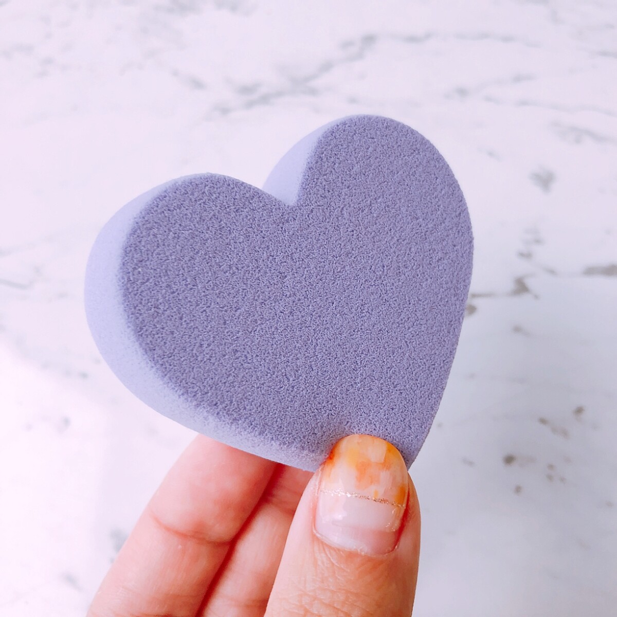 厚實但柔軟蓬鬆的心形海綿在肌膚上使用很舒適。不僅外型可愛,其實也易於使用,像尖端就很適合在鼻翼和其他精細部位精準上妝。
