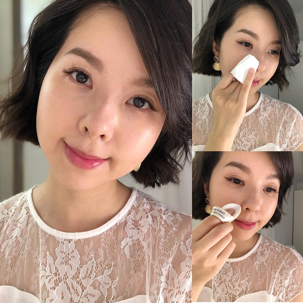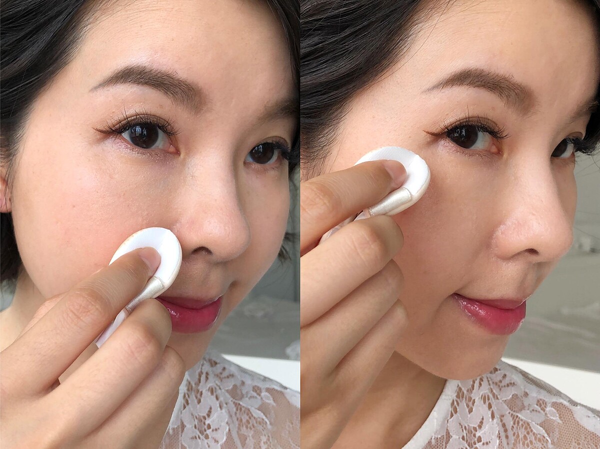 上妝時,先用3隻手指穿入粉撲緞帶中,輕壓粉底海綿1~2下,大約沾取粉撲1/3面積的量可以用半邊臉。我會從鼻翼旁和臉頰內側毛孔較粗大的部位下手,接著再用餘粉往外輕拍,將粉量集中在最想遮瑕的位置,膚質較好的臉頰用粉量就不用太重。