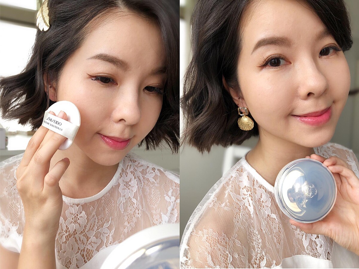 極上御藏 光羽紗煥采粉餅運用了璀璨光采技術,能對應肌膚隨時間的變化,長時間維持妝感,像是M編這天一早上妝,下午又在36度高溫下在外趴趴走了一個小時,整個人滿頭大汗、髮絲都黏在額頭上,一照鏡子嚇一跳,底妝卻沒什麼浮粉、更沒有暗沈,除了多了些油光之外,無論在室內外光線下看,妝感都維持一定的完整程度!