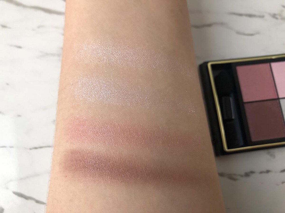 限定色 06 曙茜桔梗以日系透明感為主調,用三種溫柔的深淺粉色做漸層,右上打亮色則加入透亮感的藍色珠光,重複疊擦暈染也能保持乾淨顯色。