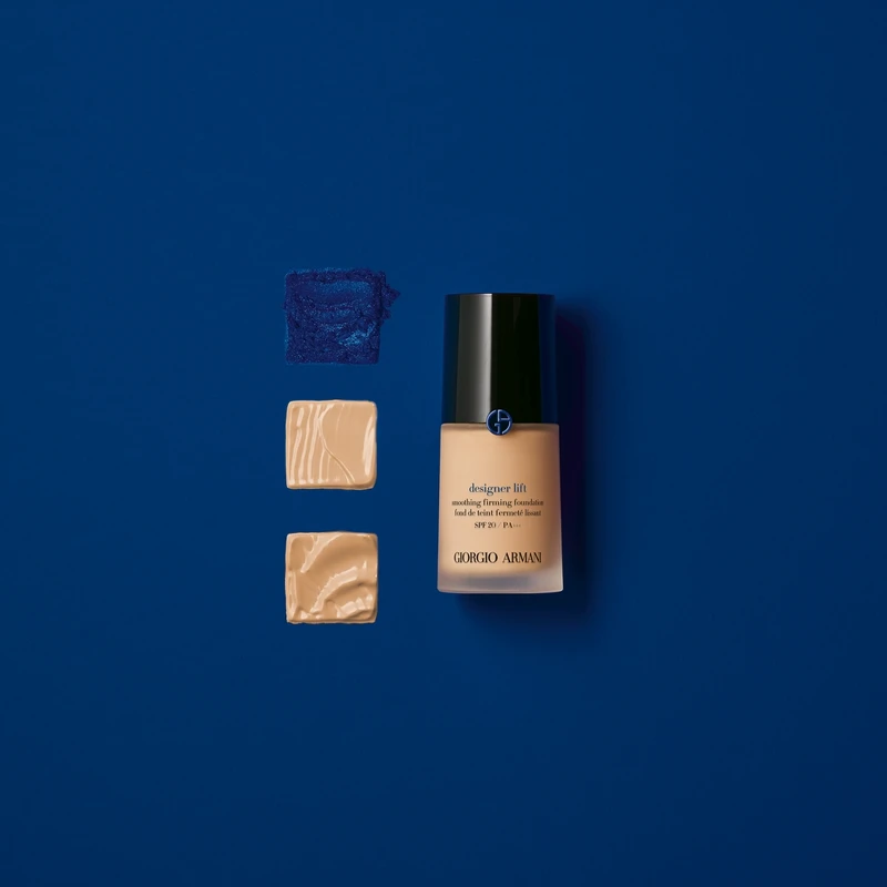 GIORGIO ARMANI的彩妝靈感一向與時裝密不可分,底妝的質地更多來自布料的發想,比如雪紡紗、或是絲絨等等。這次將在9月推出的「設計師水感光影粉底」靈感卻很特別的來自伸展台,原來是GIORGIO ARMANI秀場上的燈光一定會加入「普魯士藍光」,使模特兒的肌膚看起來更淨透白皙。因此這次就將普魯士藍光加入新粉底液當中。