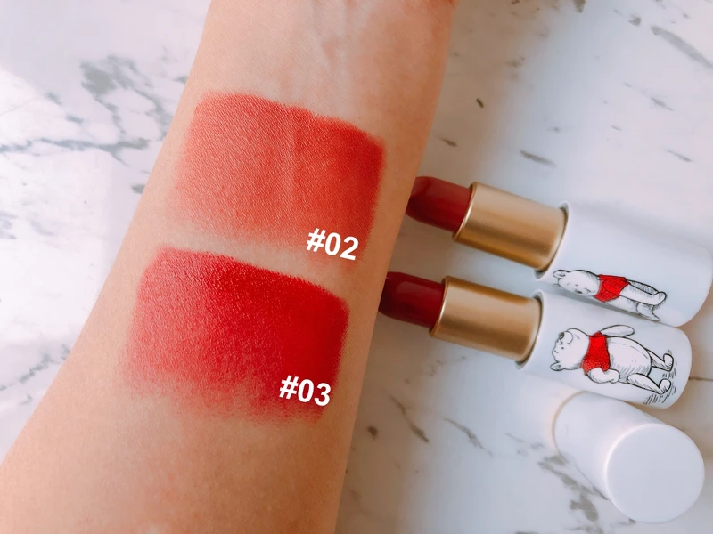小熊維尼飽和色唇膏一共推出2色:#02倫敦磚紅、#03 石榴紅。