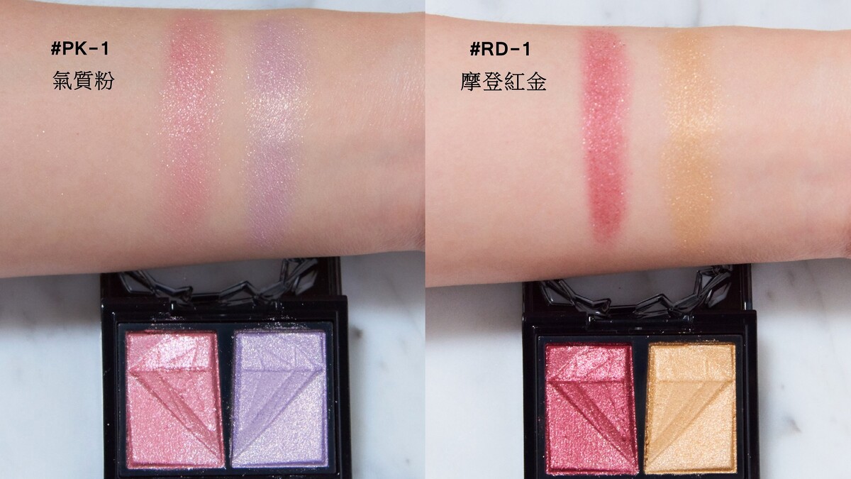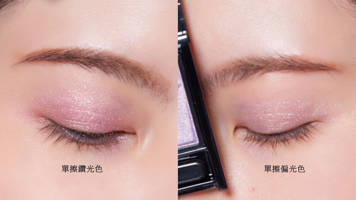 可以發現光澤感有些微不同,極度細緻、極度閃亮的鑽光色,色澤&光芒更有存在感,而極光般的偏光色則擁有較高的透明度,兩種光澤讓眼粧隨角度不同呈現更迷幻誘人的氣息。
