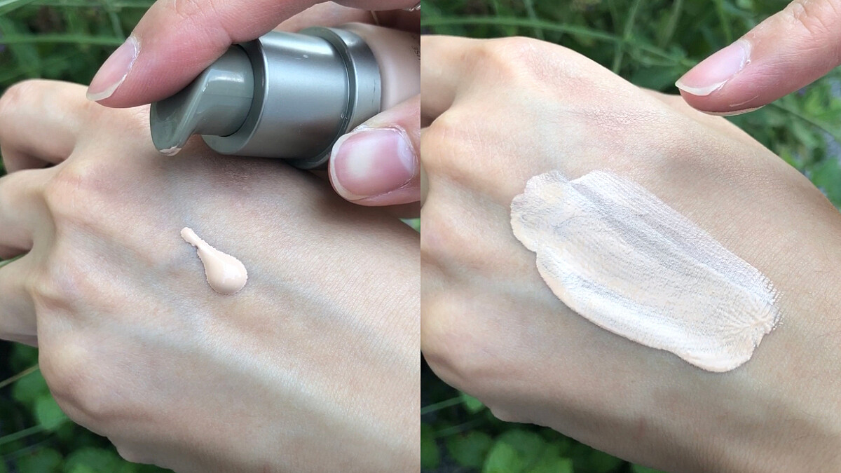 主打還有高保養成分的粉底液,質地輕薄,但因內含極淨純色粒子和光學柔焦粉體,因此還是能有絕佳的遮瑕力及提亮效果。比較特別的是不含油質成份,只以蕎麥籽萃取物、錦葵萃取物,以及梔子花萃取物等保養成份來達到滋潤保濕的狀態,所以妝感偏向半霧半光。