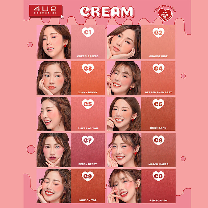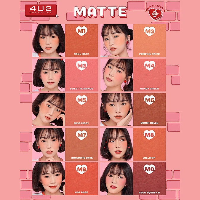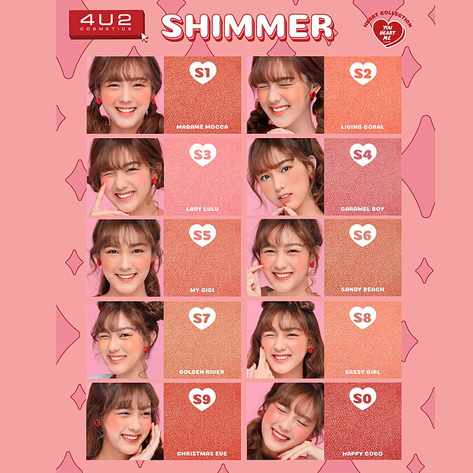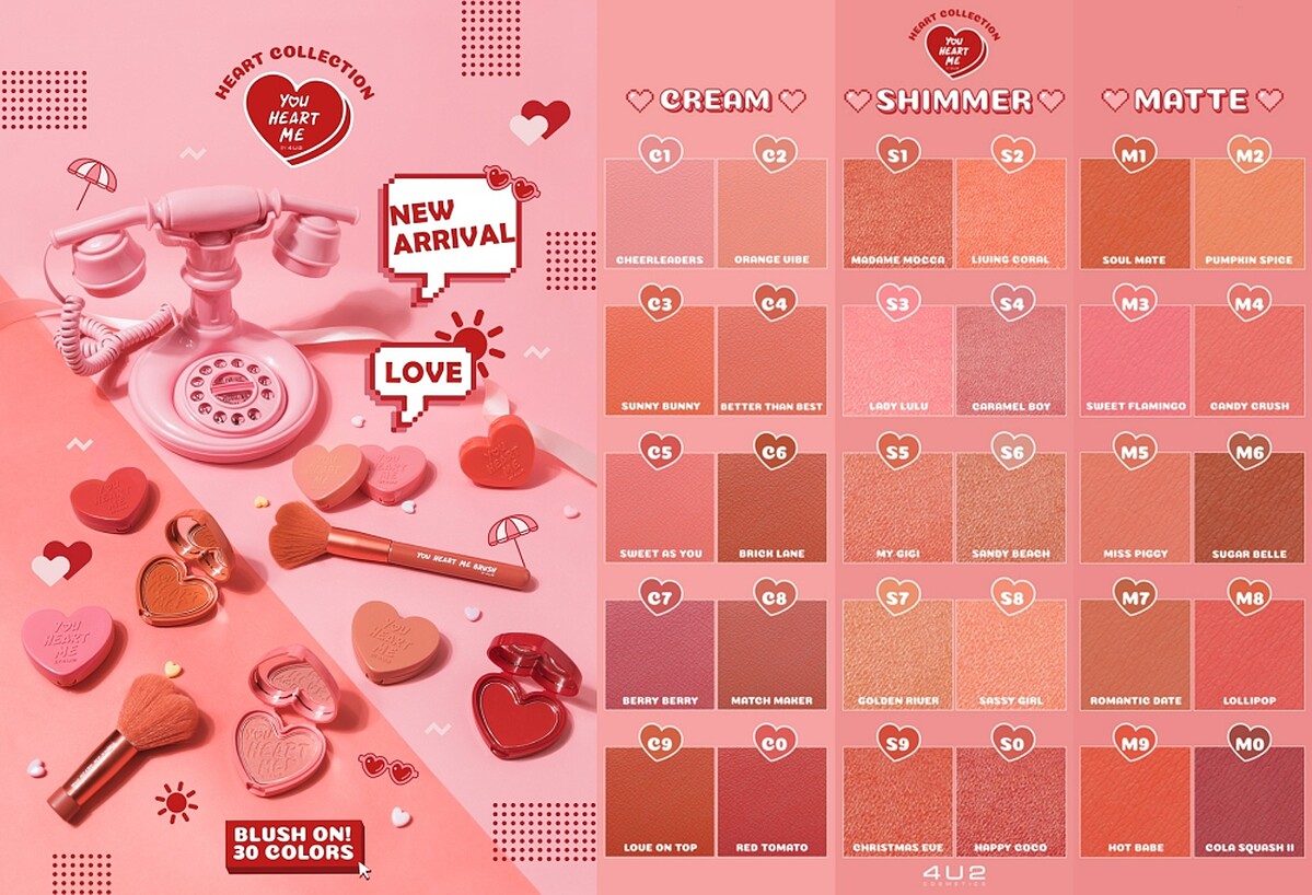 YOU HEART ME心型刻字腮紅共推出霧面(M開頭)、光感(S開頭)及慕斯(C開頭)三種質地,每款質地又有10款新色,等於一次推出30種顏色。加上台灣相對於泰國較乾冷,所以腮紅特別添加保濕成份,讓腮紅發色持色度更佳。