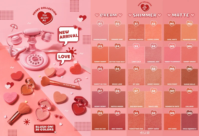 泰國彩妝4U2愛心刻字腮紅可愛到太犯規!3種質地共30款美色全登場,一秒擊中少女心