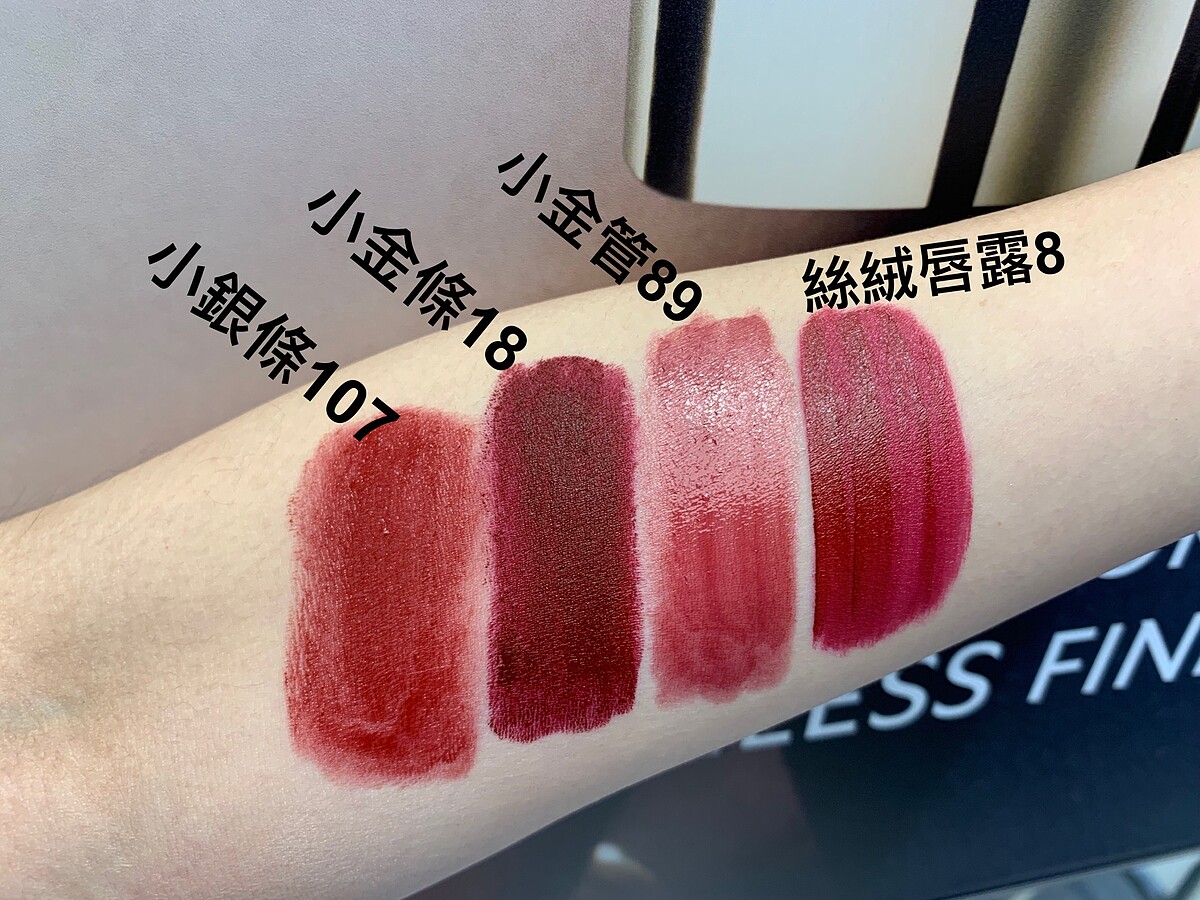 小金條(奢華緞面絲絨唇膏)#18是相當有氣場的一個色號,類似紫紅和酒紅的混合色,薄擦色彩比較像漿果紅,很有性感氣質,厚塗棕紫調變得更明顯,整個人的氣勢即被襯托出來!