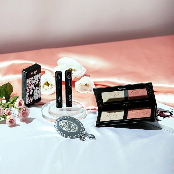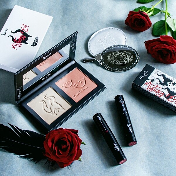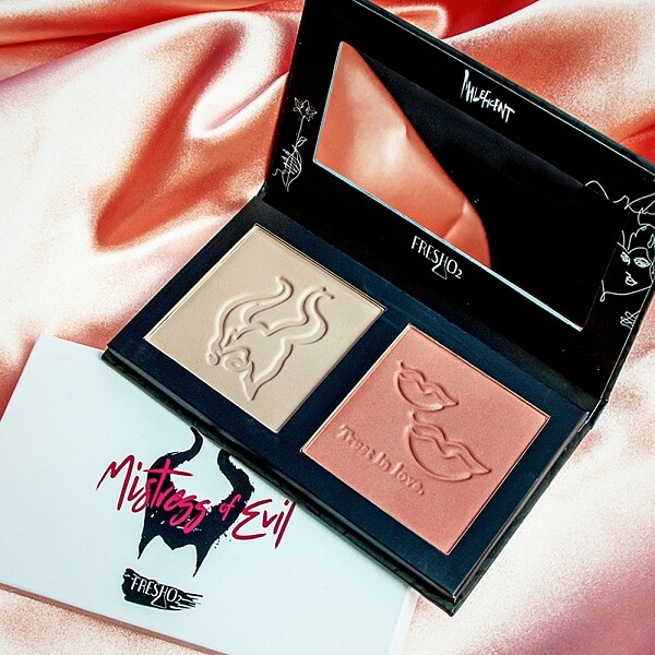 一盤同時擁有腮紅與修容,腮紅以奧羅拉公主為形象打造,各種膚色都適合的鮭魚粉色系,打造自然純真感;修容則是為黑魔女量身打造,以偏灰不帶橘的自然冷色調配出更適亞洲人膚色的修容。粉質中並添加保濕保養植物萃取,一抹顯色不顯毛孔。外盒包裝也以特殊玫瑰紋路立體手感,符合整體暗黑色彩。