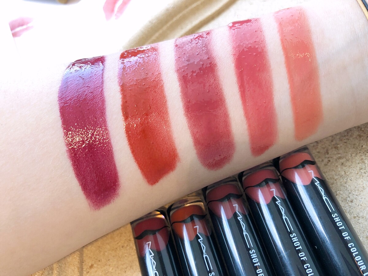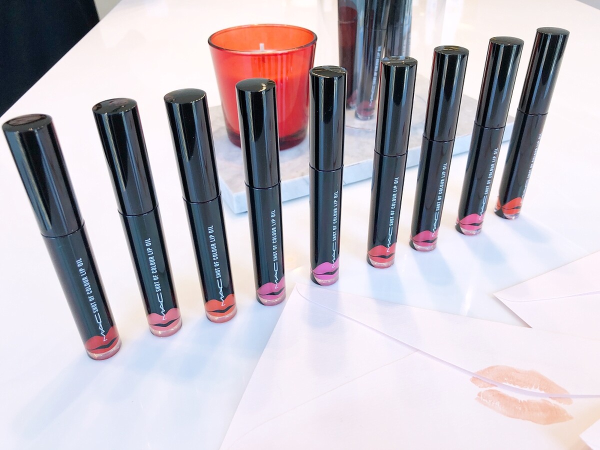 M.A.C色誘翹唇釉共推出14色,分別為:#FLASH ME!經典正紅、#SO FULL ON酒漬深紅、#HIT ME UP微醺茶玫瑰、#WHIRLED TOUR復古桃粉、#SHOCK CULTURE經典玫粉、#OFFICE FLING派對藍調粉、#BANG BANG BABY初熟小蜜桃、#COMPLETELY BLASTED迷人亮粉、#K-POP BOYFRIEND韓系炫彩粉、#SHOTS! SHOTS! SHOTS!迷情亮橘、#LET’S GO STREAKIN’!壞壞小辣椒、#PUNCH-DRUNK LOVE純情派莓莓、#EMOTIONAL OUTBURST情慾勃根地、#POCKETFUL OF SUNSHINE溫柔珊瑚橘。