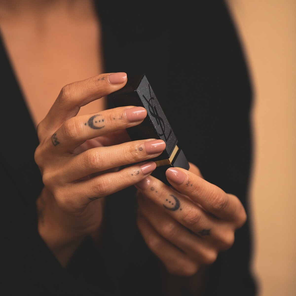 管身設計的靈感來自柔伊.克拉維茲(ZOË KRAVITZ)最喜歡的Saint Laurent包款「Niki包」,在全黑外包裝鑲上黑色LOGO,並點綴經典黑鴉片瓶身上的銀色亮粉。