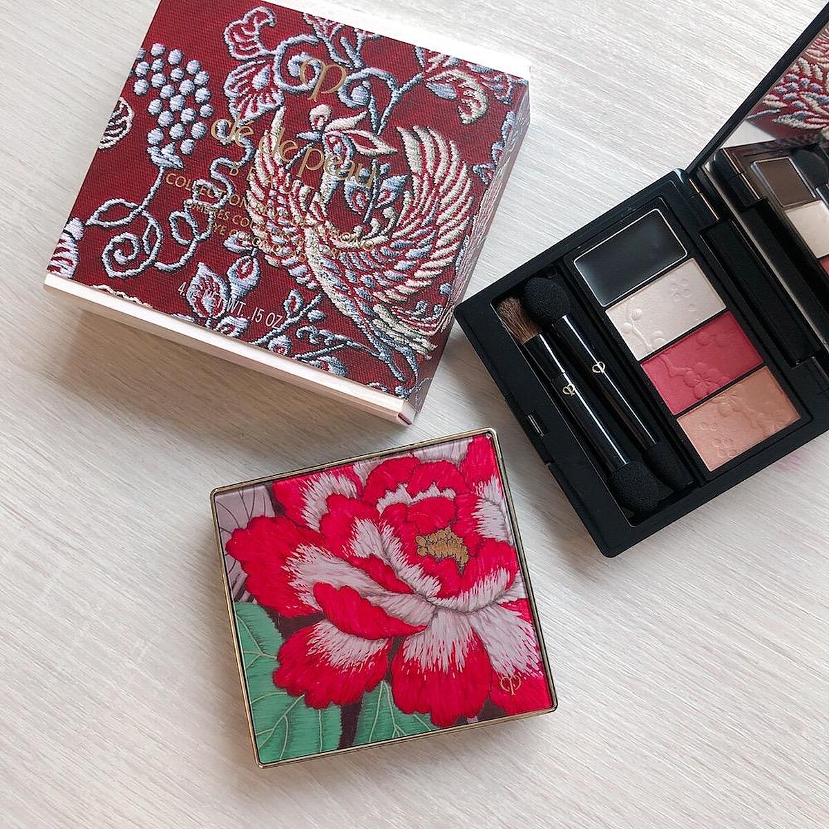 四色眼影盤外盒是一朵鮮艷的大紅花,眼影上壓印著櫻花圖案,最左邊黑色為霜狀質地,可以用於描繪眼線、加強深邃感,接著是白色打底色、櫻花粉色和裸粉色。