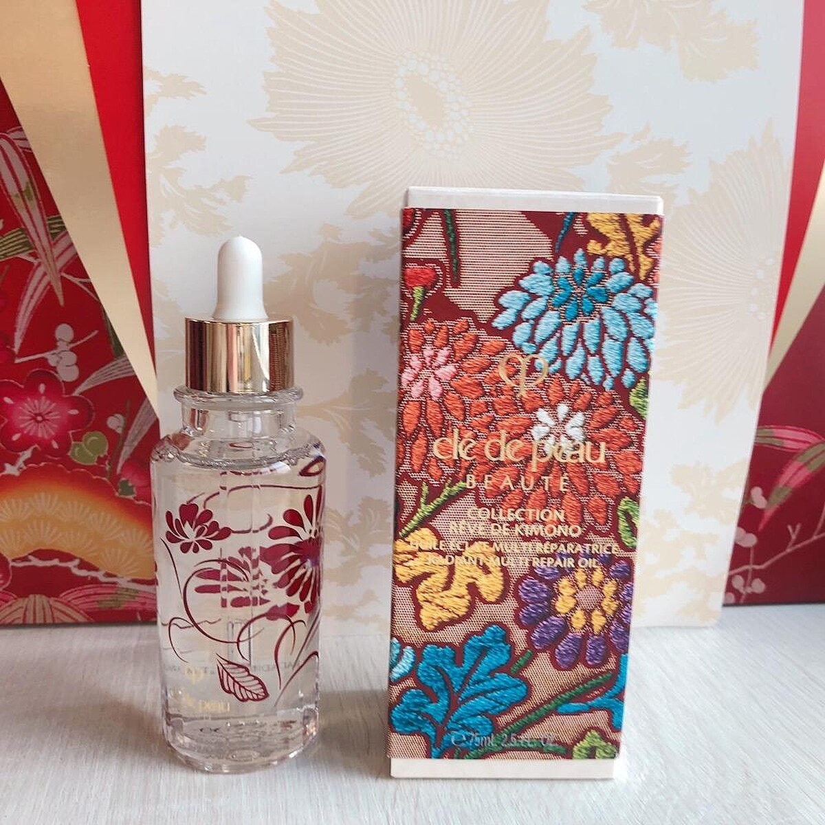 保養品中挑選了光采修護菁華油做限量設計,透明玻璃瓶身印上紅色花紋,搭配的外盒也唯一朵朵繽紛花朵,看起來十分清新。