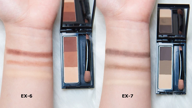 這次更引領秋冬時尚潮流,推出「3D造型眉彩餅 (限定色)」兩款新色:黑糖橄欖灰EX-7 &性感紅橘棕EX-6,讓女孩們可依髮色、瞳孔顏色或服裝穿搭/心情來做挑選。M編也貼心的一次比對KATE四種眉彩餅試色喔~