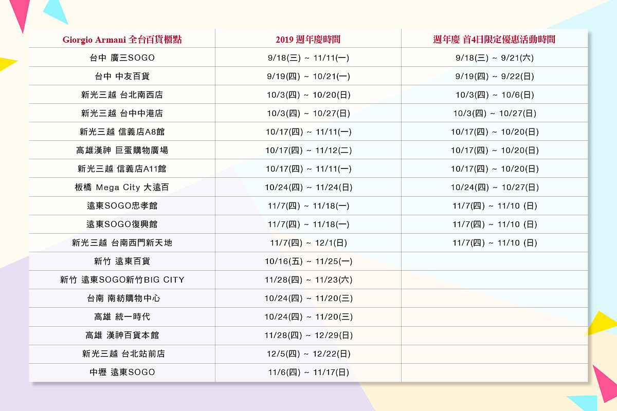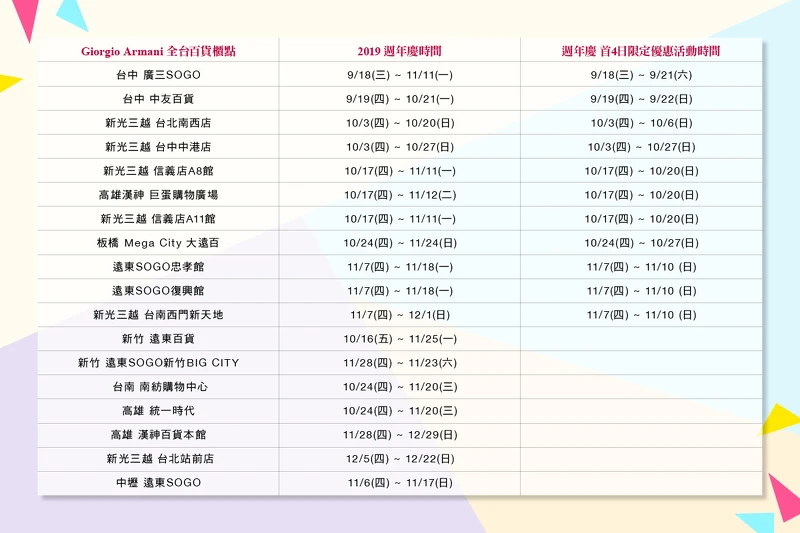 【Giorgio Armani 2019週年慶日期與首4日限定優惠專櫃】