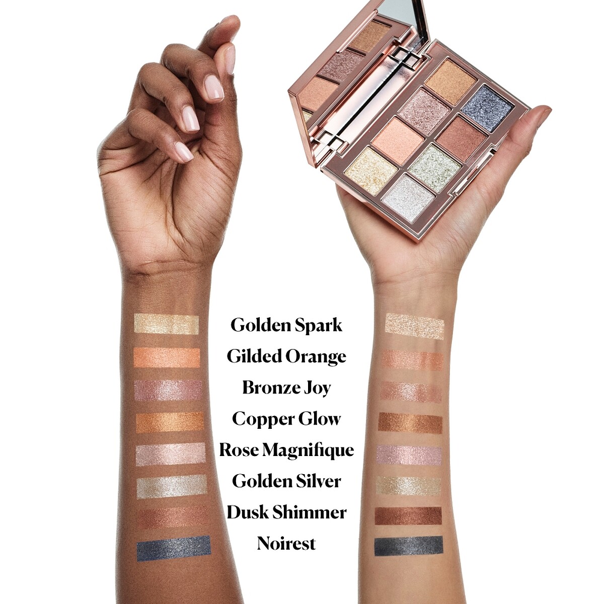 共推出兩款,一個是為熱愛眼影的彩妝控設計的「燦金眼彩修容盤」,15色眼影加上4色頰彩,輕鬆完成多變風格妝容。喜歡珠光眼影的人則可嘗試「燦金8色眼彩盤」,細緻珠光粉末搭配秋冬玫瑰暖色調,打造秋冬知性成熟 Look。