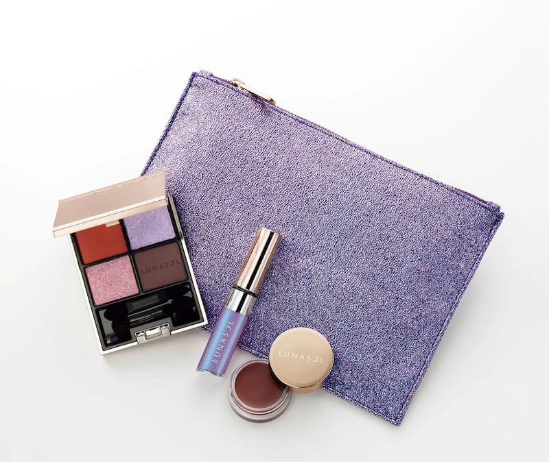 內含:晶巧霓光眼彩盒 EX03、晶巧霓光唇彩(光豔) EX01、晶巧光豔唇頰霜 EX01、派對化妝包