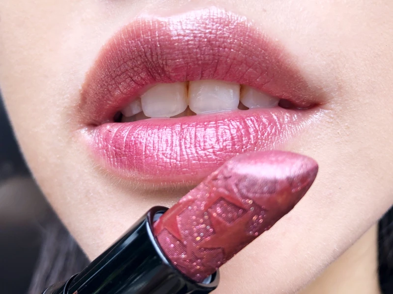 當中奢華絲絨訂製唇萃-恆燦星光限定版的#527星空玫瑰,擦起來是帶金粉的玫瑰色,讓雙唇嬌嫩動人。