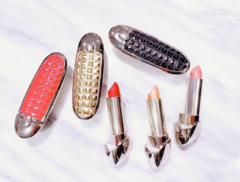 嬌蘭今年以璀璨金漾為主題推出聖誕彩妝,當中紅寶之吻唇膏的3色都是不種質地,包含柔霧光酒紅色N94、金屬光裸膚米N95,以及緞光豐潤紅木色N96。唇膏彩殼也同步推出3款,鉚釘皮革紋切割面的設計看起來相當奢華。