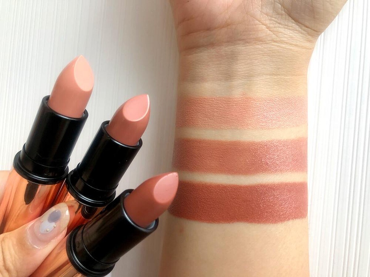 一盒包含3支玫瑰金香檳的子彈唇膏,色彩都是溫柔絕美的奶茶色