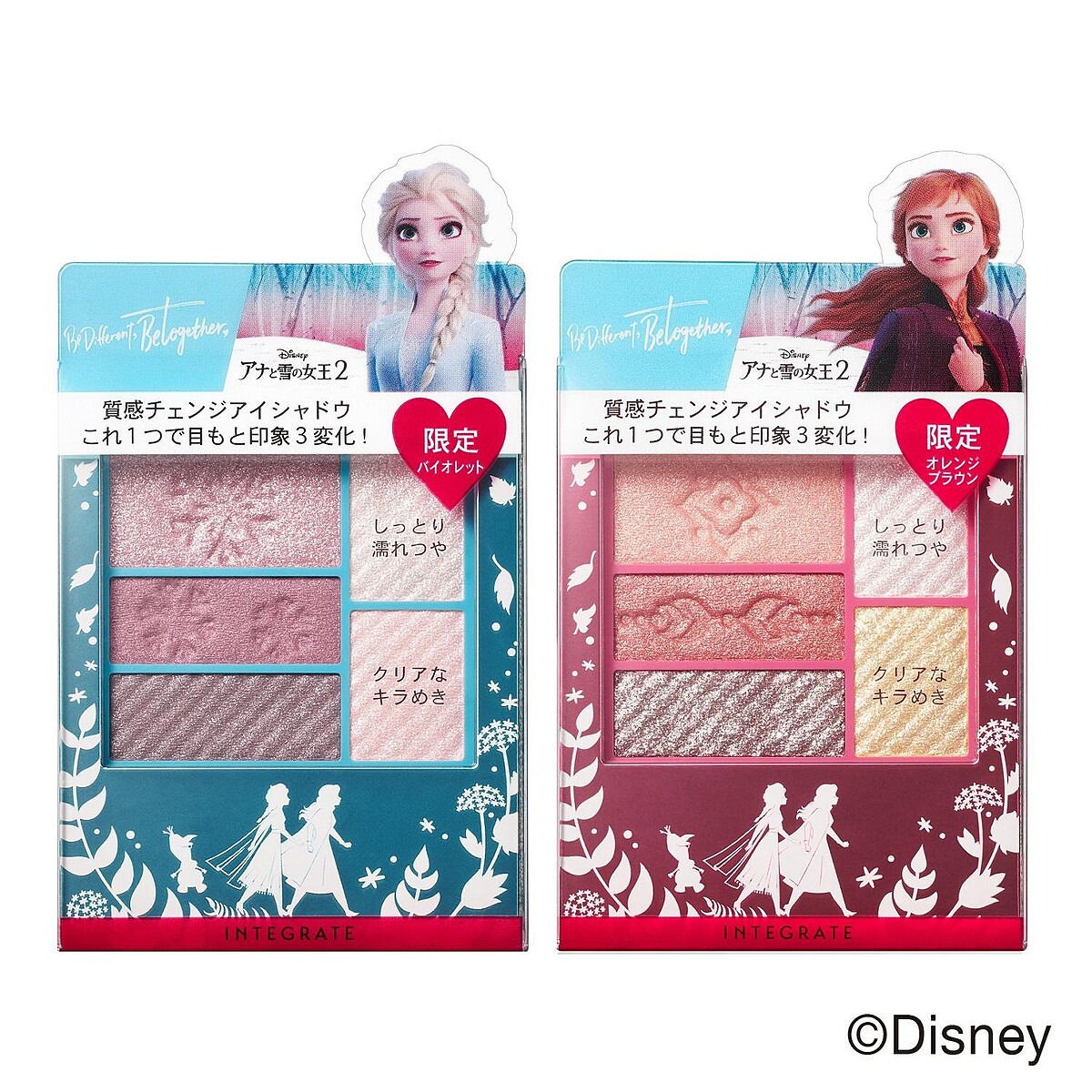 Integrate三度漸層光綻眼影盒將依照艾莎與安娜的個性妝容量身打造兩款限定色,包括夢幻仙氣、粉紫色系的艾莎限定色#F210與溫暖楓紅、大地色系安娜限定色#F220。