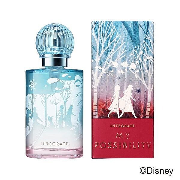 更搭配限定包裝設計:森林裡的艾莎與安娜,兩位姊妹攜手前進。香水瓶身則採用Integrate特有的圓潤晶透瓶身,澄澈的冰藍漸層紅色系,就像走入了冰雪奇緣的世界。
