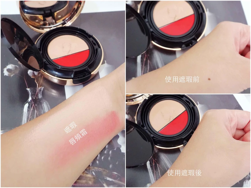 黑眼圈或痘疤瑕疵較嚴重時,可以先使用局部遮瑕再使用氣墊。遮瑕膏質地柔滑,延展性非常好,一推開就非常服貼肌膚,強力遮瑕卻非常自然,M編真心大推遮瑕膏真的很強,根本完勝許多專櫃遮瑕品!絲絨質地的唇頰兩用霜,非常顯色,只要沾取1~2次,就有自然好氣色!3 in 1變形金剛級微臻氣墊真的太方便,M編親自認證過在人擠人的捷運上,再手殘都可以快速完成無瑕膨皮的好氣色妝容,用過就直接收入心頭好名單!