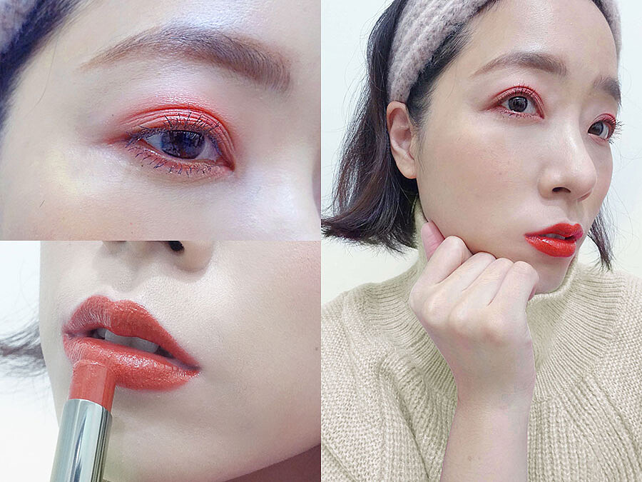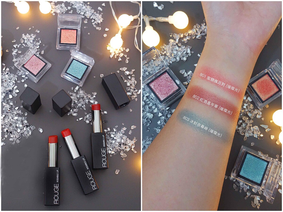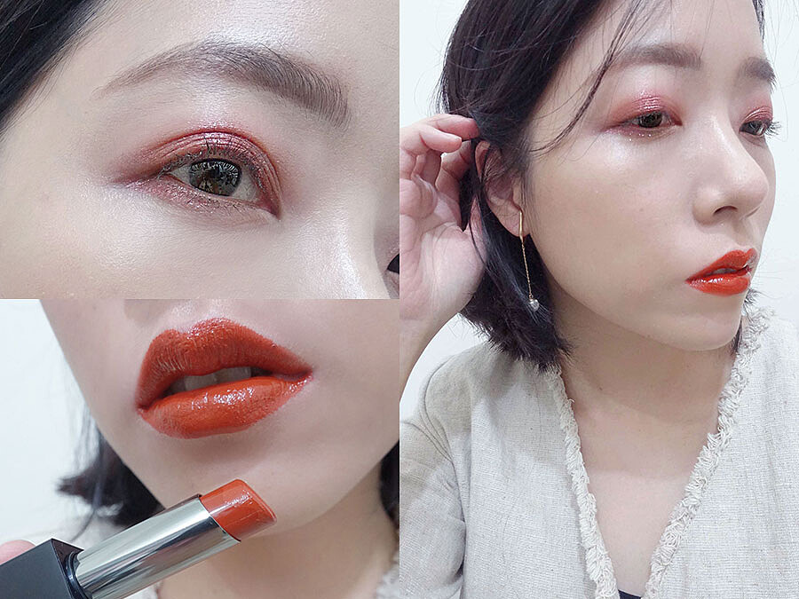#802 紅酒嘉年華,微紅的葡萄酒色,優雅又超級顯白,配上華麗的銀色亮粉,光澤真心美到心坎裡,大面積塗抹在上下眼影也一點都不誇張,迷濛閃耀的微醺眼神搭配#011楓糖歐蕾優雅南瓜色唇妝,優雅氣場完全意圖使人戀愛!