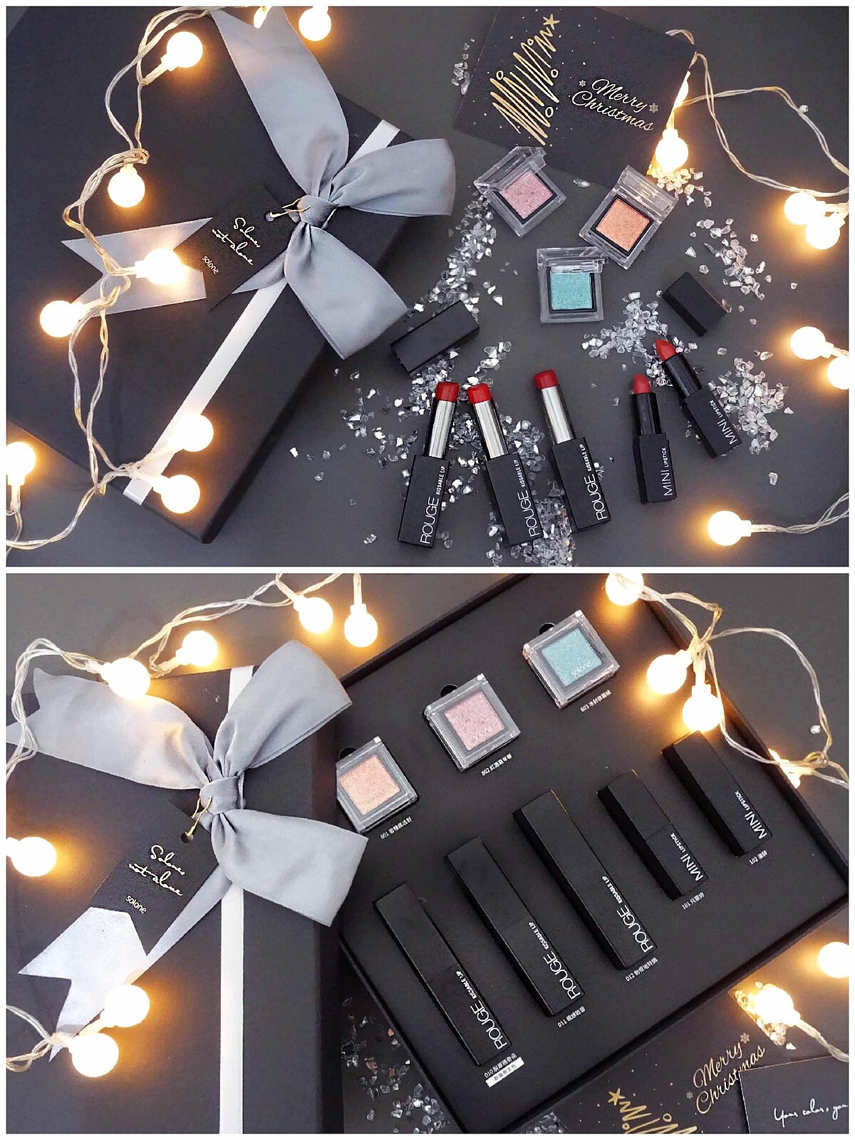 Solone推出外包裝超美超時尚的限定聖誕禮盒,包含M編使用的珠光唇膏、緞光唇膏、以及亮片眼影,一盒直接入手脫單夢想色, 還有2隻Solone 迷你小唇膏,派對上美到稱霸全場,預備好收割心儀歐巴吧!超級少量,要請要快!